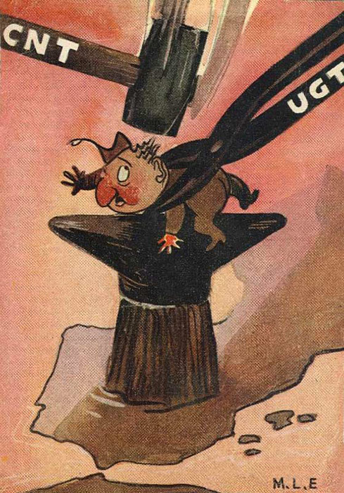 Plakate der anarchistischen Bewegung, der marxistischen POUM (am Ende der Galerie) sowie gemeinsame Plakate von CNT und UGT (sozialistische Gewerkschaft). Plakate waren ein wesentlicher Teil der Propaganda aller politischer Bewegungen, konnten doch durch die Bilder die Inhalte transportiert und auch AnalphabetInnen erreicht werden (Spanien hatte zu Beginn der 30er-Jahre durch ein ausgeprägtes Klassenbildungssystem eine AnalphabetInnenrate von rund 30%). Eine weitere umfangreiche Galerie findet sich bei Libcom.
