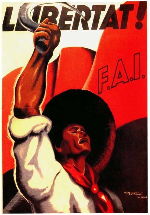Plakate der anarchistischen Bewegung, der marxistischen POUM (am Ende der Galerie) sowie gemeinsame Plakate von CNT und UGT (sozialistische Gewerkschaft). Plakate waren ein wesentlicher Teil der Propaganda aller politischer Bewegungen, konnten doch durch die Bilder die Inhalte transportiert und auch AnalphabetInnen erreicht werden (Spanien hatte zu Beginn der 30er-Jahre durch ein ausgeprägtes Klassenbildungssystem eine AnalphabetInnenrate von rund 30%). Eine weitere umfangreiche Galerie findet sich bei Libcom.