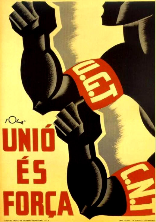 Plakate der anarchistischen Bewegung, der marxistischen POUM (am Ende der Galerie) sowie gemeinsame Plakate von CNT und UGT (sozialistische Gewerkschaft). Plakate waren ein wesentlicher Teil der Propaganda aller politischer Bewegungen, konnten doch durch die Bilder die Inhalte transportiert und auch AnalphabetInnen erreicht werden (Spanien hatte zu Beginn der 30er-Jahre durch ein ausgeprägtes Klassenbildungssystem eine AnalphabetInnenrate von rund 30%). Eine weitere umfangreiche Galerie findet sich bei Libcom.