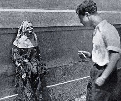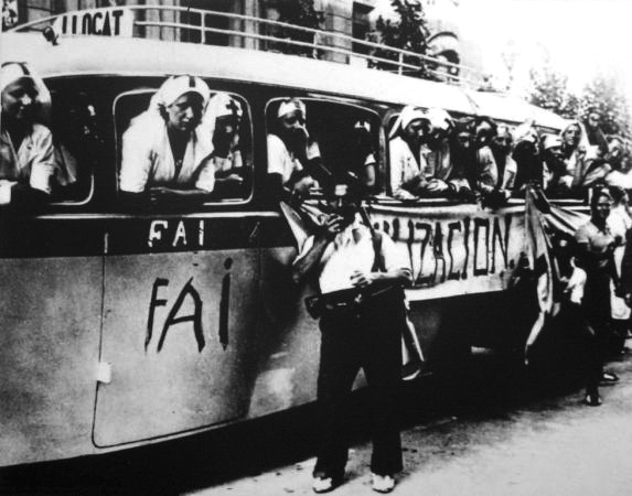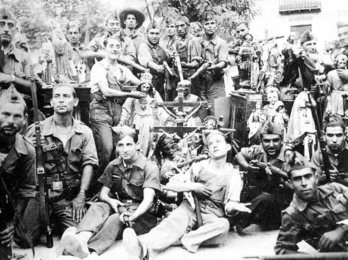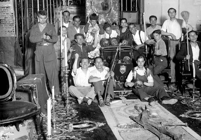 Bilder aus dem spanischen Bürgerkrieg. Die Bilder verwüsteter Kirchen sind vor dem Hintergrund der Herrschaftsrolle der spanischen Kirche zu sehen, die sich auf die Seite der herrschenden Klasse gestellt hatte. Während der Sozialen Revolution entlud sich die jahrzehntelang aufgestaute Wut in verschiedenen Regionen in der Zerstörung von katholischen Kirchen und Klöstern und in Gewalt und Morden gegen katholische KirchenvertreterInnen. Tausende von ihnen wurden in der "republikanischen Zone" ermordet, ebenso FaschistInnen (oder wer dafür gehalten wurde) und andere politische GegnerInnen - ein wenig rühmliches Kapitel des Spanischen Bürgerkriegs. Etwa 50.000 Menschen verloren so nach Paul Preston in den ersten Monaten ihr Leben in den republikanischen Gebieten. Dem standen auf der anderen Seite gezielte Massaker und als Kriegsstrategie eingesetzte Massenvergewaltigungen der Nationalisten gegenüber: alleine beim Massaker von Malaga starben bis zu 10.000 Menschen. Die Zahl der bei Massenerschießungen getöten RepublikanerInnen nach Ende des Bürgerkriegs wird auf Zehntausende geschätzt. Auch AnarchistInnen und anarchistische Milizen waren für Morde verantwortlich, einige kritische Texte dazu wurden in den letzten Jahren in der "Graswurzelrevolution" veröffentlicht. Eine weitere Bildergalerie findet sich bei Libcom.