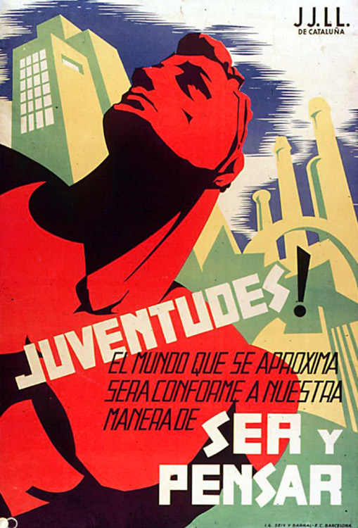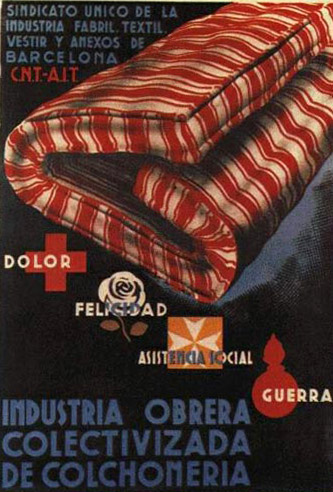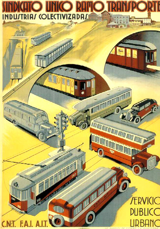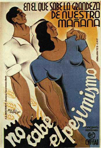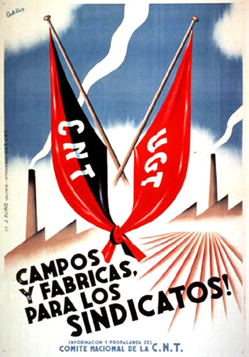 Plakate der anarchistischen Bewegung, der marxistischen POUM (am Ende der Galerie) sowie gemeinsame Plakate von CNT und UGT (sozialistische Gewerkschaft). Plakate waren ein wesentlicher Teil der Propaganda aller politischer Bewegungen, konnten doch durch die Bilder die Inhalte transportiert und auch AnalphabetInnen erreicht werden (Spanien hatte zu Beginn der 30er-Jahre durch ein ausgeprägtes Klassenbildungssystem eine AnalphabetInnenrate von rund 30%). Eine weitere umfangreiche Galerie findet sich bei Libcom.