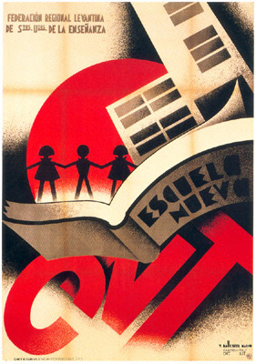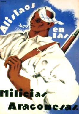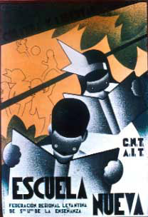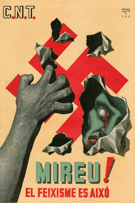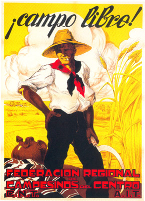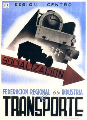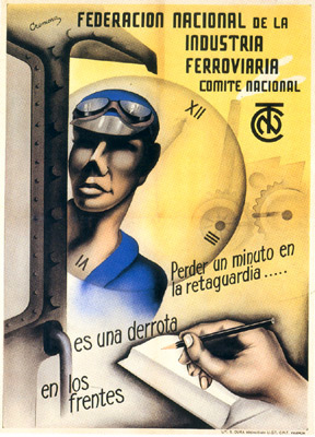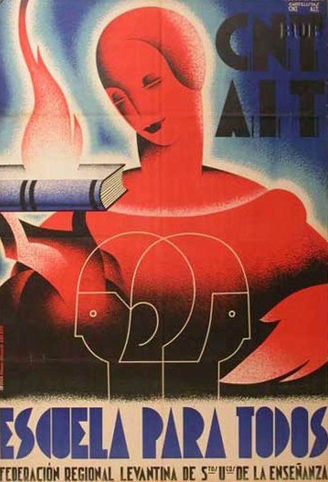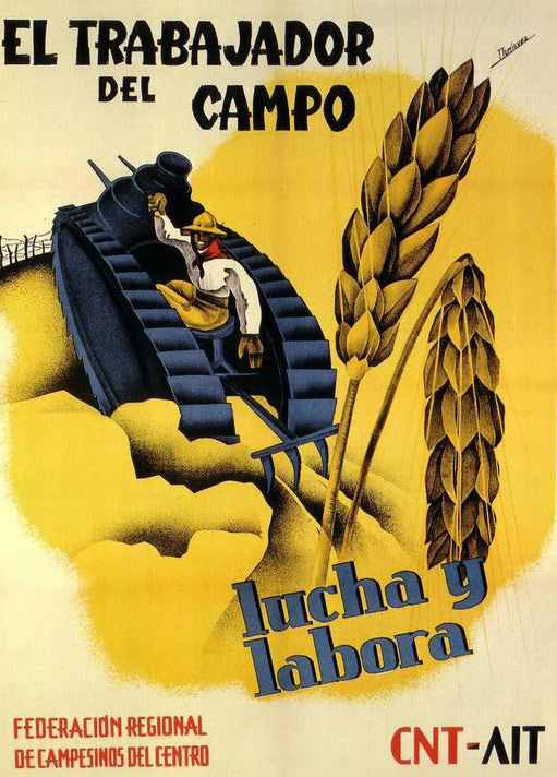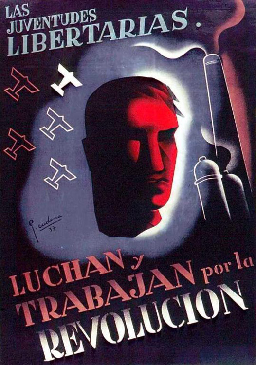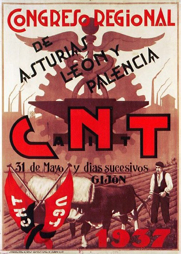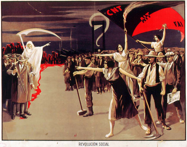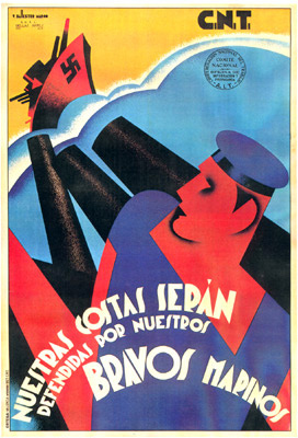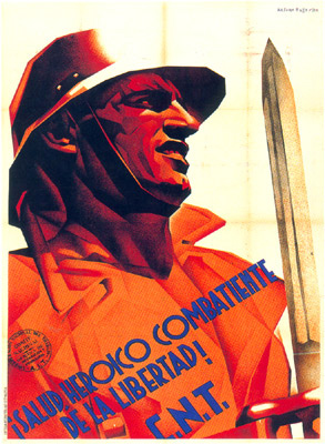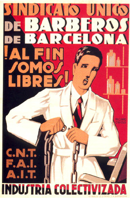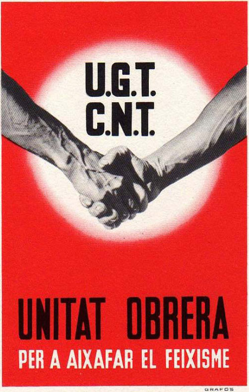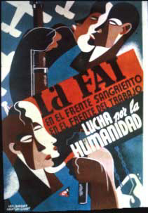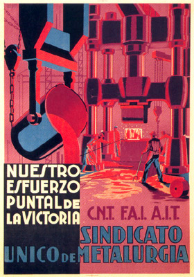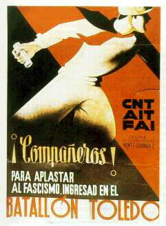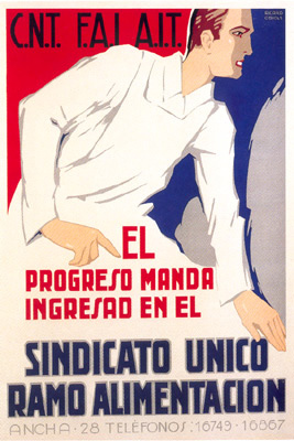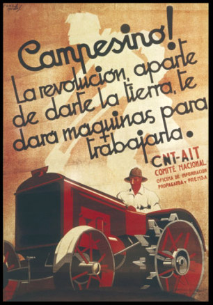 Plakate der anarchistischen Bewegung, der marxistischen POUM (am Ende der Galerie) sowie gemeinsame Plakate von CNT und UGT (sozialistische Gewerkschaft). Plakate waren ein wesentlicher Teil der Propaganda aller politischer Bewegungen, konnten doch durch die Bilder die Inhalte transportiert und auch AnalphabetInnen erreicht werden (Spanien hatte zu Beginn der 30er-Jahre durch ein ausgeprägtes Klassenbildungssystem eine AnalphabetInnenrate von rund 30%). Eine weitere umfangreiche Galerie findet sich bei Libcom.