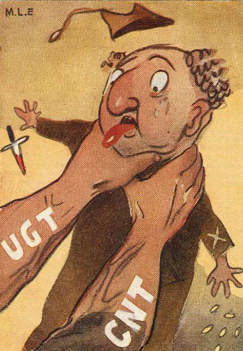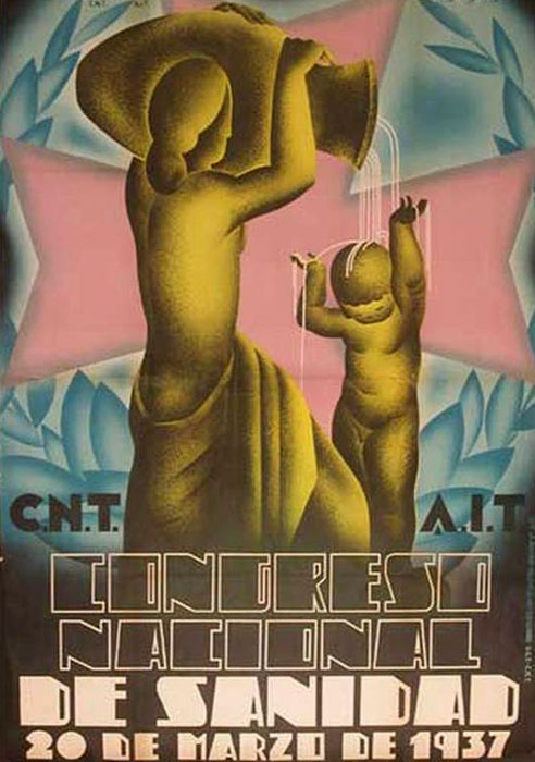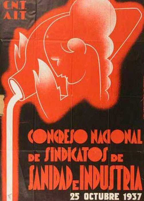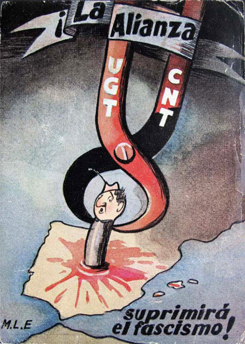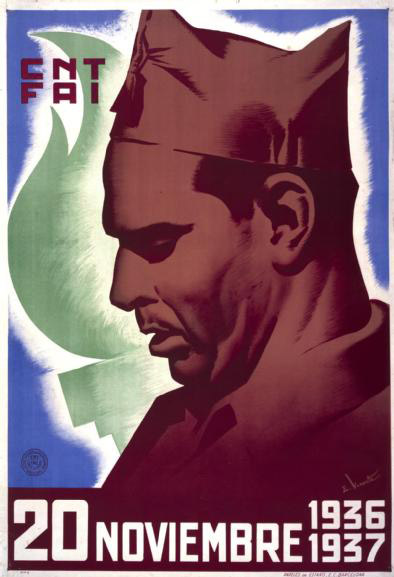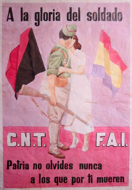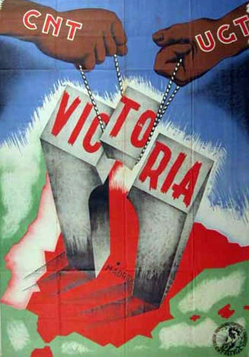 Plakate der anarchistischen Bewegung, der marxistischen POUM (am Ende der Galerie) sowie gemeinsame Plakate von CNT und UGT (sozialistische Gewerkschaft). Plakate waren ein wesentlicher Teil der Propaganda aller politischer Bewegungen, konnten doch durch die Bilder die Inhalte transportiert und auch AnalphabetInnen erreicht werden (Spanien hatte zu Beginn der 30er-Jahre durch ein ausgeprägtes Klassenbildungssystem eine AnalphabetInnenrate von rund 30%). Eine weitere umfangreiche Galerie findet sich bei Libcom.