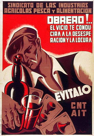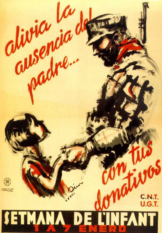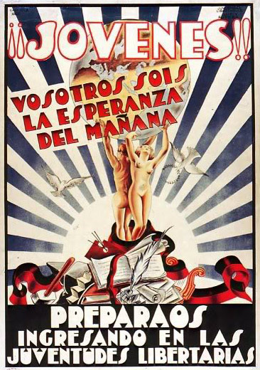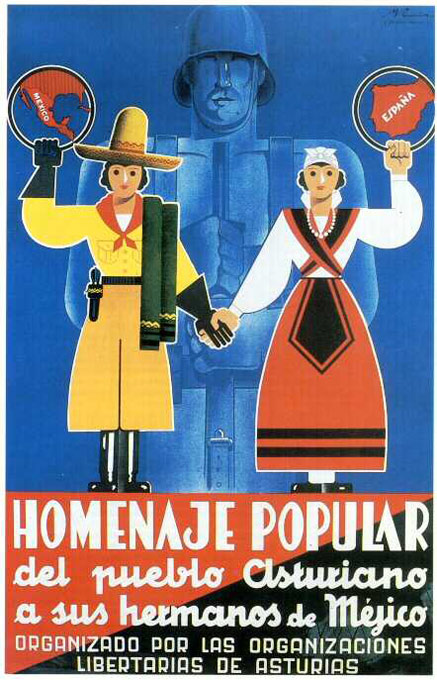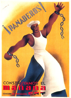 Plakate der anarchistischen Bewegung, der marxistischen POUM (am Ende der Galerie) sowie gemeinsame Plakate von CNT und UGT (sozialistische Gewerkschaft). Plakate waren ein wesentlicher Teil der Propaganda aller politischer Bewegungen, konnten doch durch die Bilder die Inhalte transportiert und auch AnalphabetInnen erreicht werden (Spanien hatte zu Beginn der 30er-Jahre durch ein ausgeprägtes Klassenbildungssystem eine AnalphabetInnenrate von rund 30%). Eine weitere umfangreiche Galerie findet sich bei Libcom.