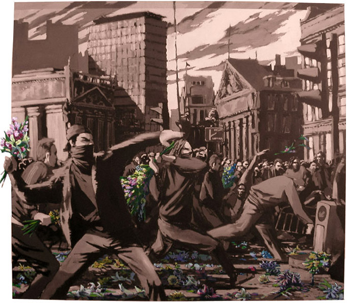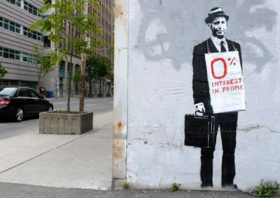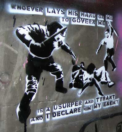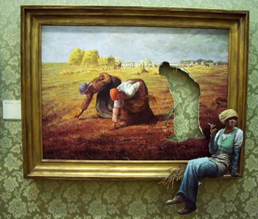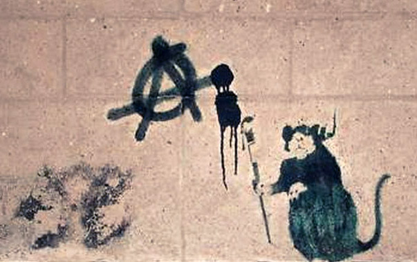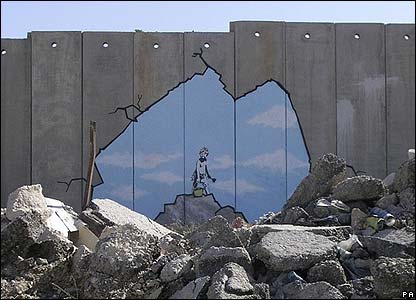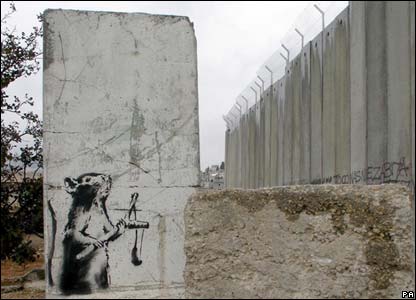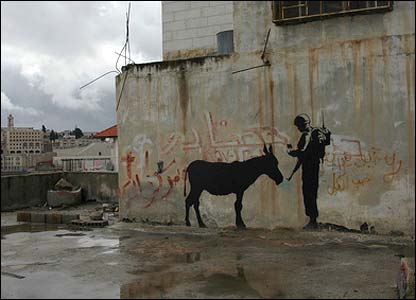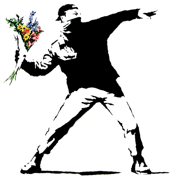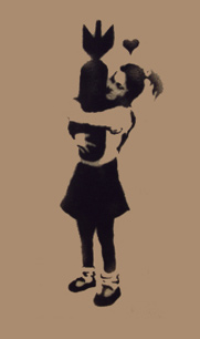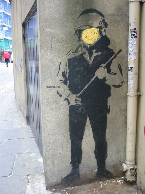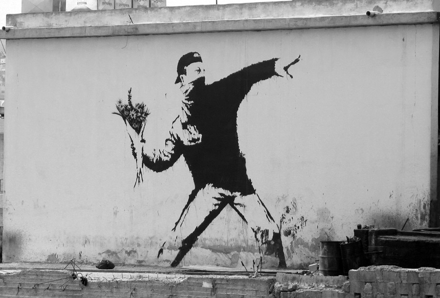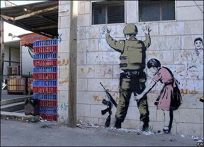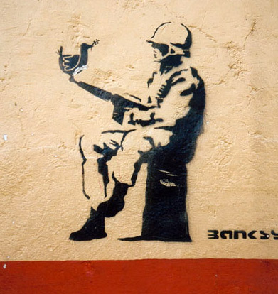 Banksy gehört wohl zu den bekanntesten zeitgenössischen Streetart-KünstlerInnen. In seinen Arbeiten bedient er sich Mitteln der Kommunikationsguerilla um alternative Sichtweisen auf politische Themen zu verbreiten.